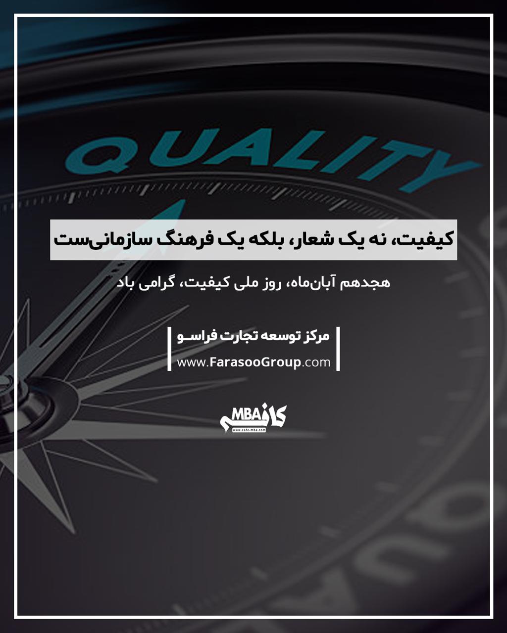 اهتمام و فعاليت مرکز توسعه تجارت فراسو (کافه MBA) همواره بر اين اصل استوار بوده است كه خدمتی متنوع و ارزنده و باکیفیت به مراجعین ارائه نماید. روز ملی کیفیت روزی است برای تقدیر از کارکنان، کارشناسان و مدیرانی که به گونهای برای بهبود کیفیت خدمات سازمان تلاش میکنند.